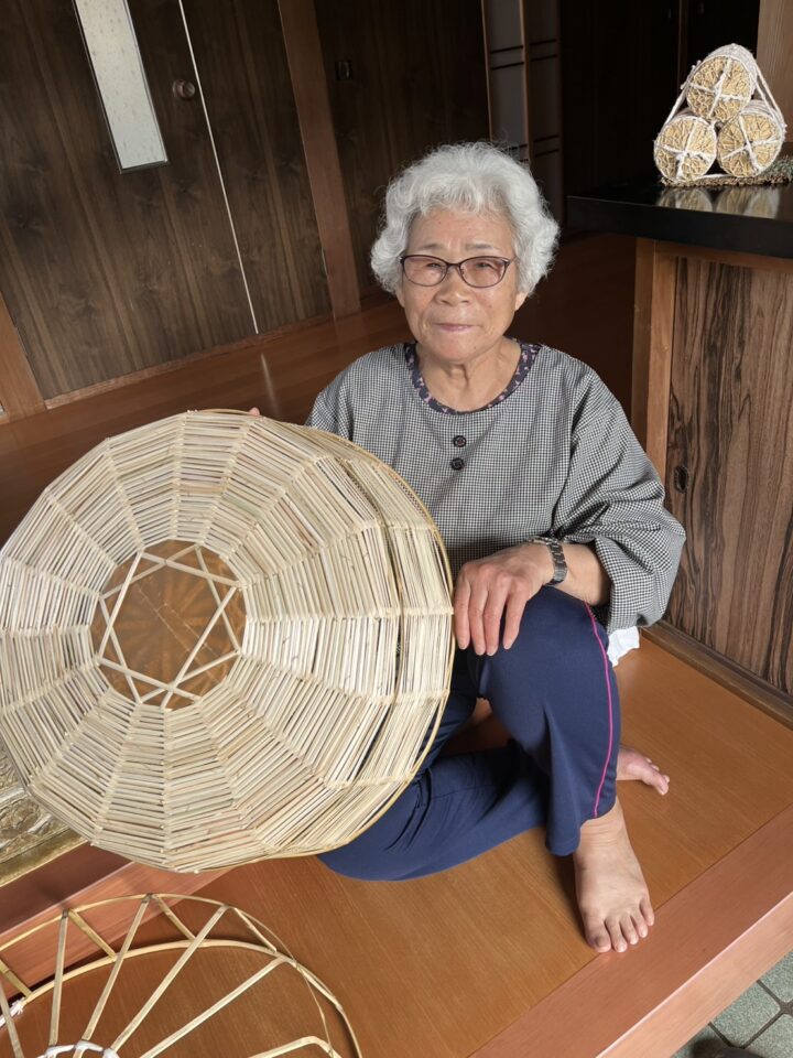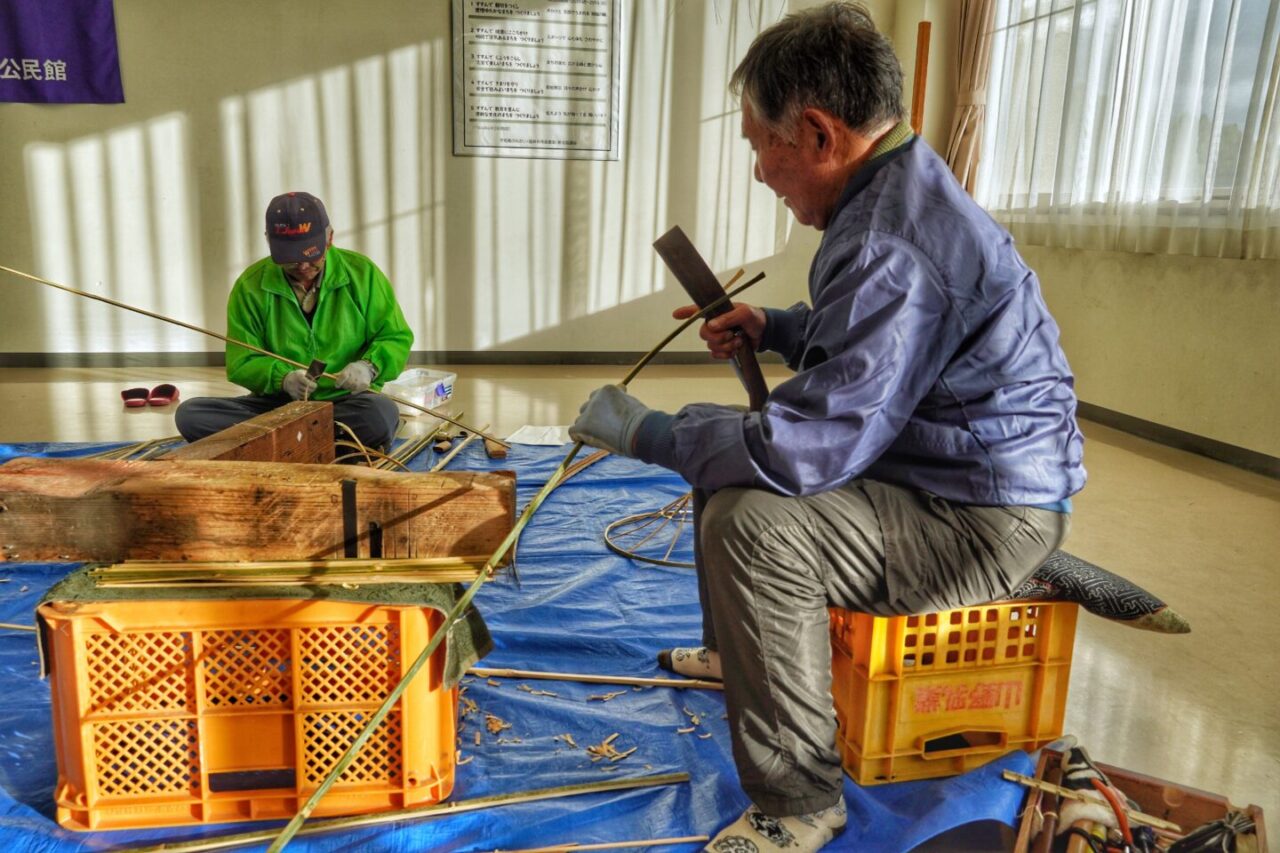 竹を割って笠の骨組を作ります。男性のお仕事になります。竹は切り芯を考えつつ行わなければ綺麗な円形に仕上がりません。長年の経験や勘が求められる作業です。