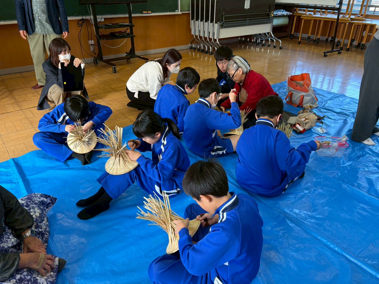 令和7年11月、今年も清水東小学校ですげ笠づくり体験学習が開催されました。参加者は5年生の児童のみなさんです。