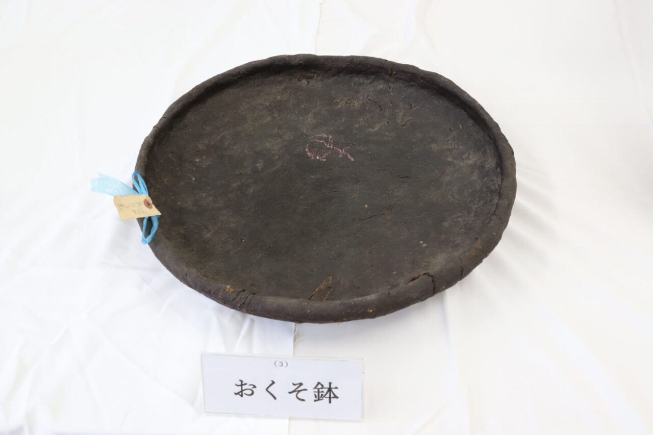 「おくそ」とは--麻を取りほぐして、中にある「お」(麻)を取り出す時、「お」の回りに黒っぽい不純物が出ます。それはやや粘土質で糞(くそ)に似ているところから「麻の糞」(おくそ)と言われ、それで作る鉢ということで「おくそばち」、漢字で書くと「麻糞鉢」となります。