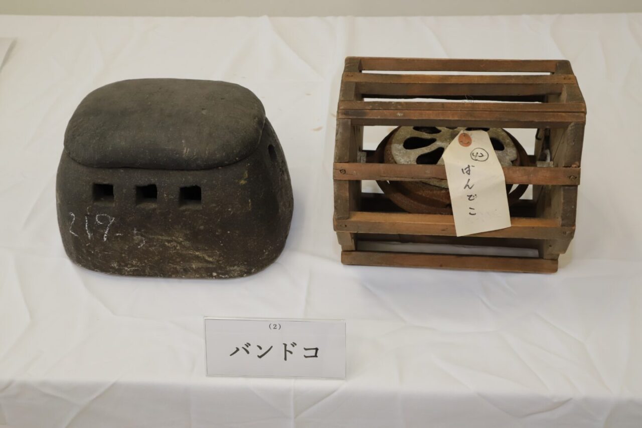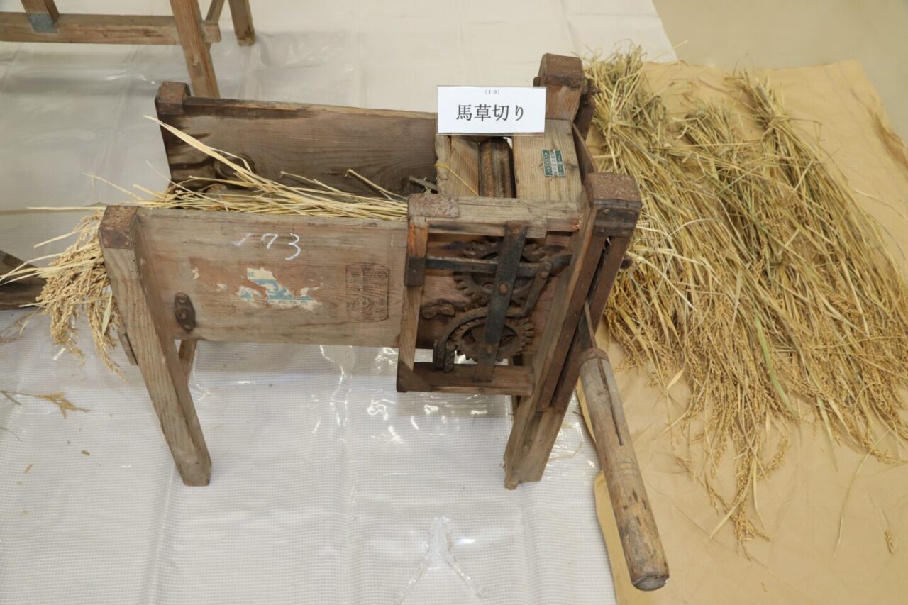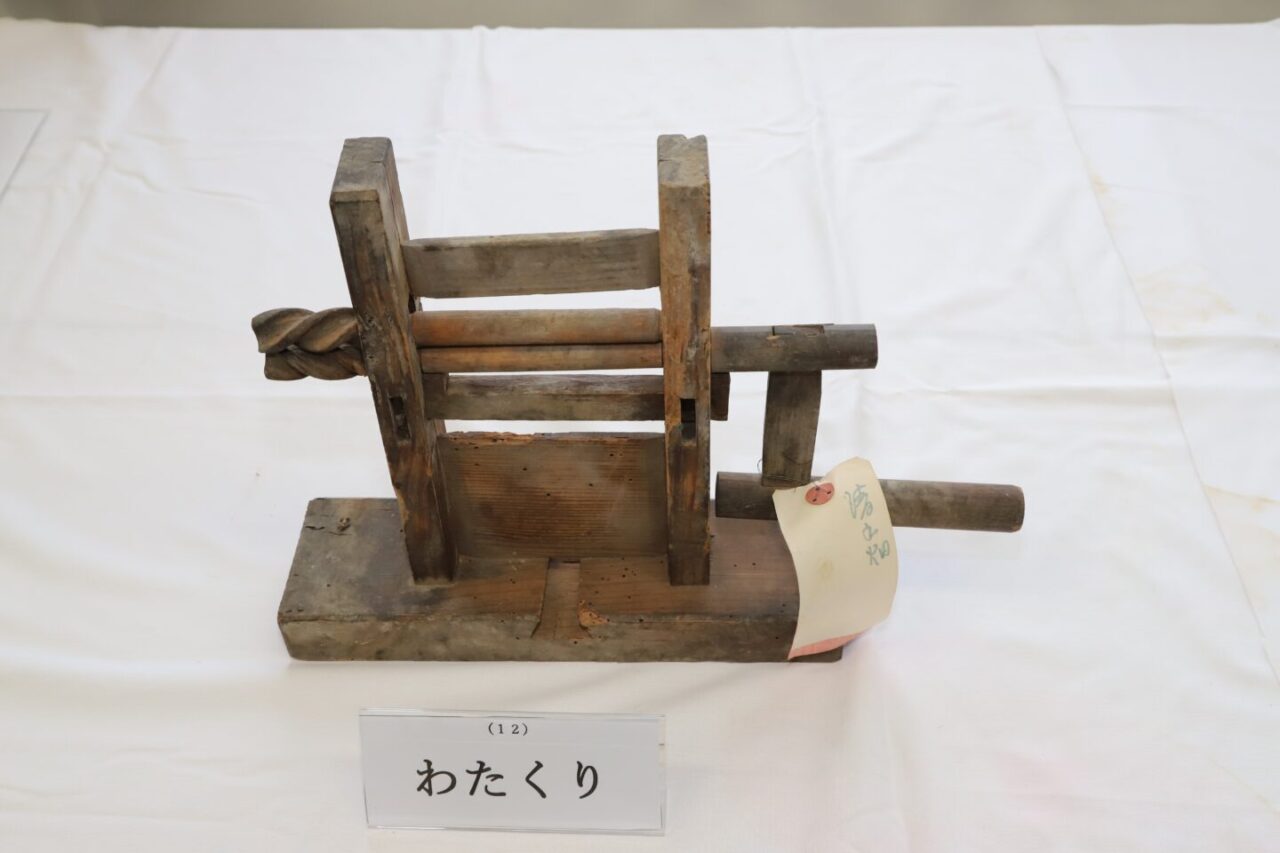 使用した道具を展示されました。展示の民具は、昭和50年頃に当時の清水町青年団OB(清水町郷土研究会)が民家から収集したものです。