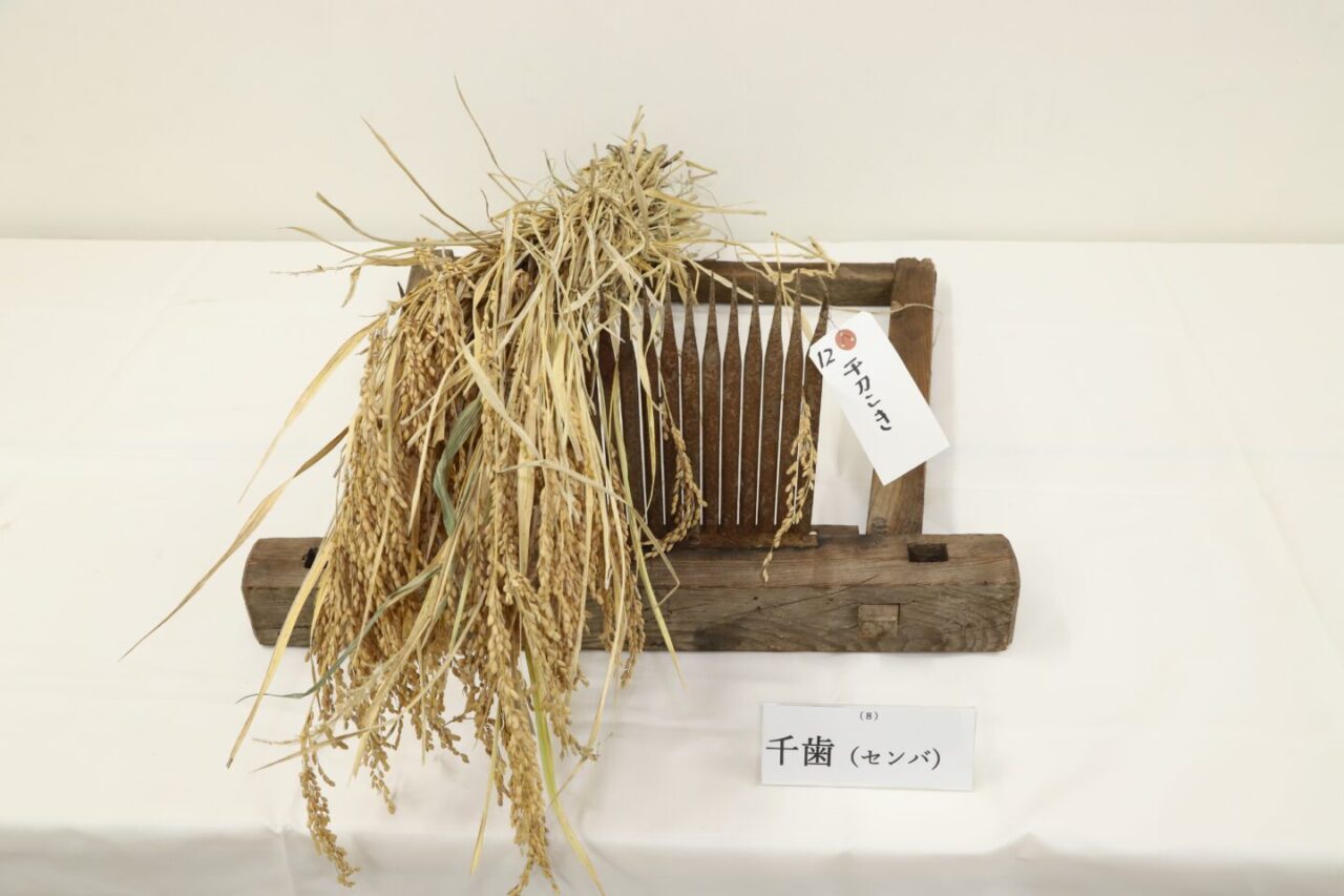 千歯こきという方法が行われたのは、江戸~明治~大正にまたがっています。清水町では「まんが」と呼ばれており、使い方は木部を固定して歯の付いている部分に乾燥させた稲束をはさみ入れてこき(わらともみに分ける)ます。若狭地方は千歯の産地として有名でした。