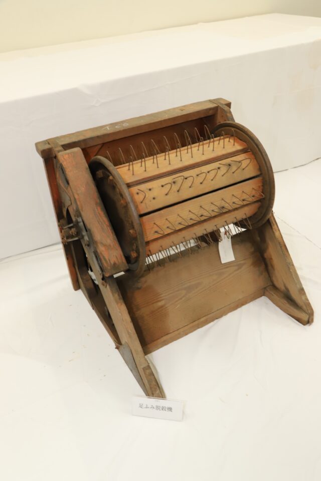 明治43年に出現したこの機械は、農作業の一大変革をもたらし、百年来の千歯こきに比べ、使い方は足ふみする事でドラムを回転させ、その上に稲束を乗せるという簡単なもので、3~4分の1に労働を軽減する事になりました。大正の中頃、山内の笹木一冶氏は、改良型を発明して、全国に普及させ、おおいに貢献をされました。また電力が入ってからはモーターで回転させるものもありました。しかし、ヤタ(穂にもみが残ったもの)だけは昔のままヤタカチ棒で叩いてはずしました。