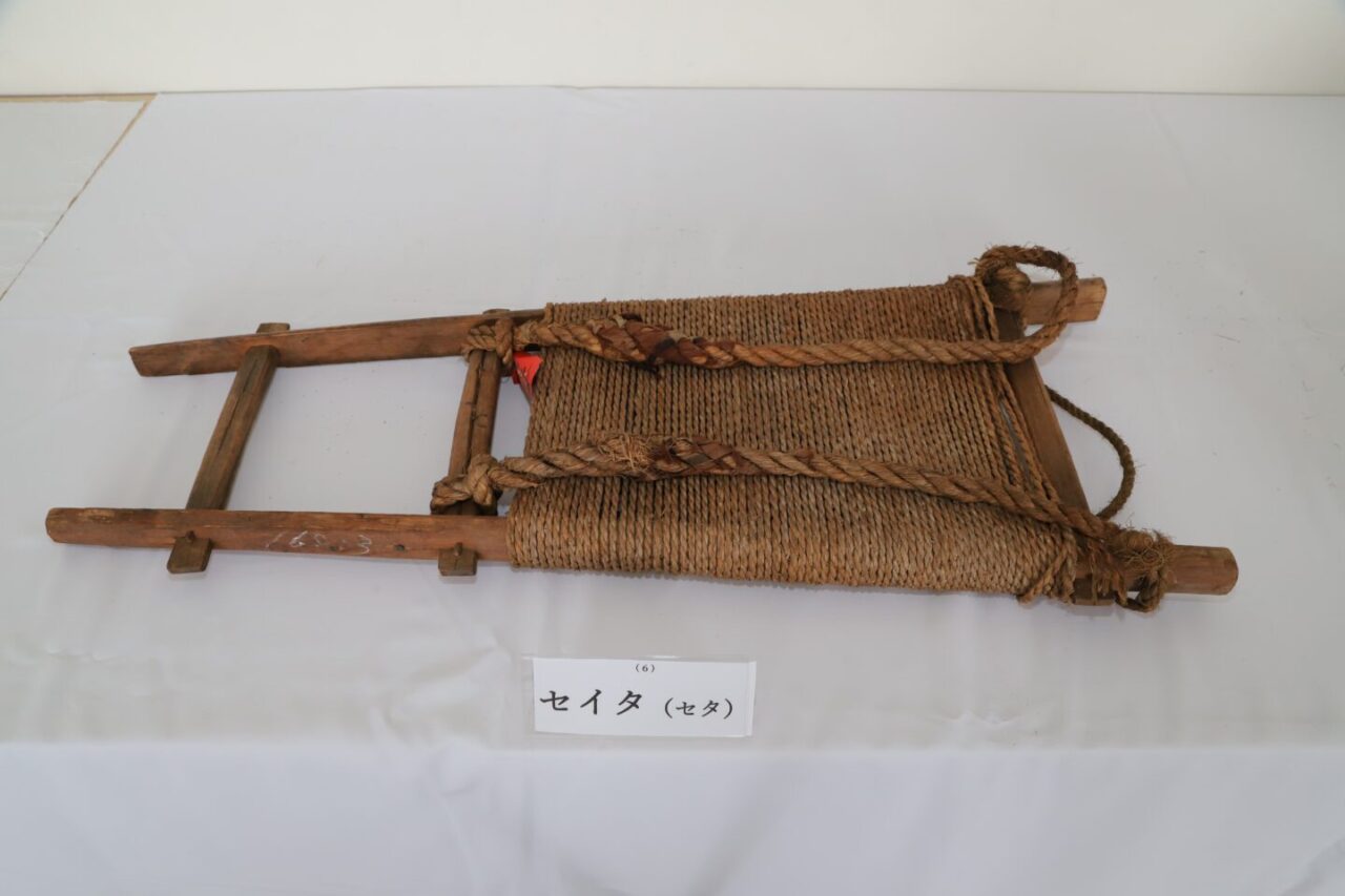 昔は、割木など重いものを背負うためにセイコ、セタ、セイタ(背板)が使われた。木を背中に合わせて組んだもの、写真のように藁やきれ、麻お、しななどをまぜて丈夫に三つ編みにしたセナカアテ(背中当て)をつけたものがある。地方によって様々な形があり、Lの字のようなツメ、ウデギがついているものなど土地柄でも大きさが変わっている。