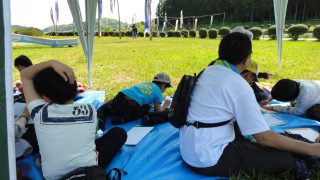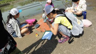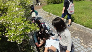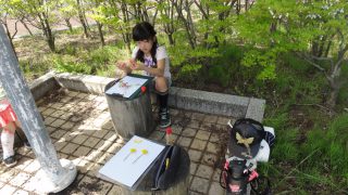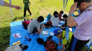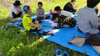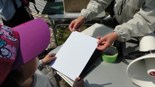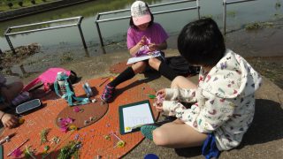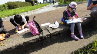 志津川ラブリバーに着き、さっそく写生大会。鉛筆で下書きして、色塗りは、草や花を切り貼りして、春の色に仕上げました。