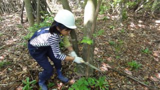 実際に生えている木をのこぎりで切り倒す作業。